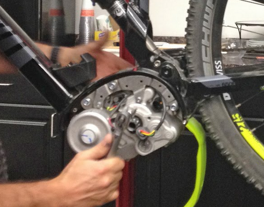 ① sejmout rameno pedálu a plastový kryt středového pohonu (povolením TORX šroubů) na opačné straně, než je umístěn talíř rozety řetězu. Pod tímto krytem jsou umístěny kabely a potřebné konektory.